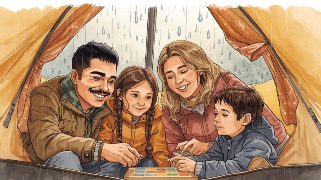 We woke the next morning to cloudy skies, but my dad was finally able to get the stove started. Mom made a hot breakfast and we had just finished cleaning up our campsite when it started to rain. 🌧️ My family ended up inside the tent playing card games while my parents constantly reminded my brother and me not to touch the sides of the tent to keep water from getting in. As you could imagine, it was not a fun day.
