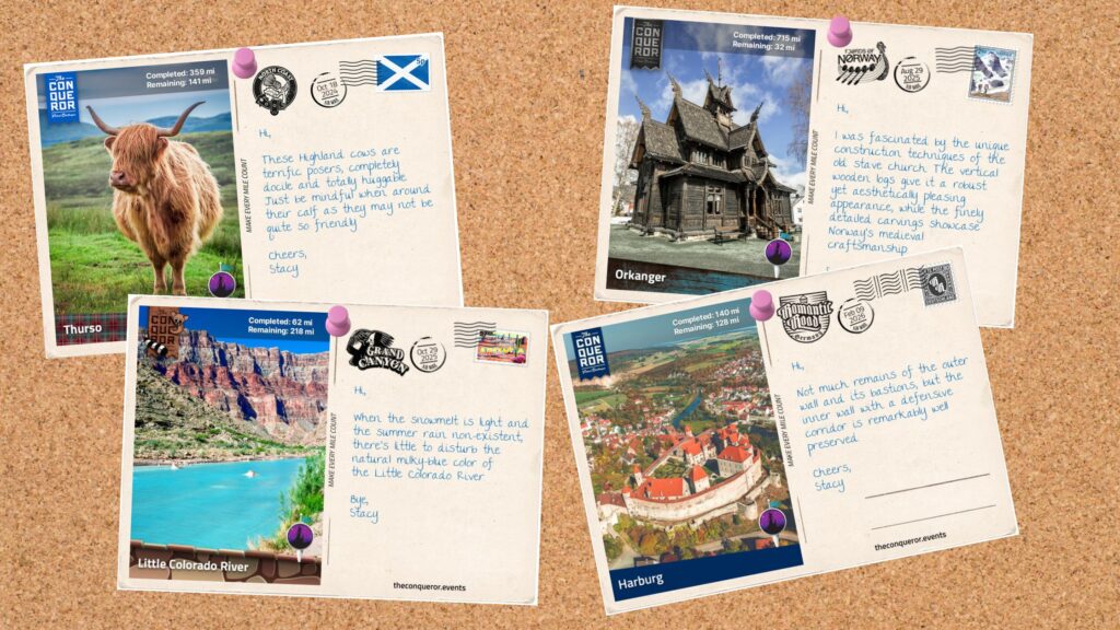 The Conqueror app offers virtual walking challenges that cover different distances. You get to set your own pace. You choose how much you want to walk and how long you want to take to finish the challenge. As you make progress, the app will send updates, including postcards of the places you virtually visit and interesting facts about landmarks and sites along the trail.